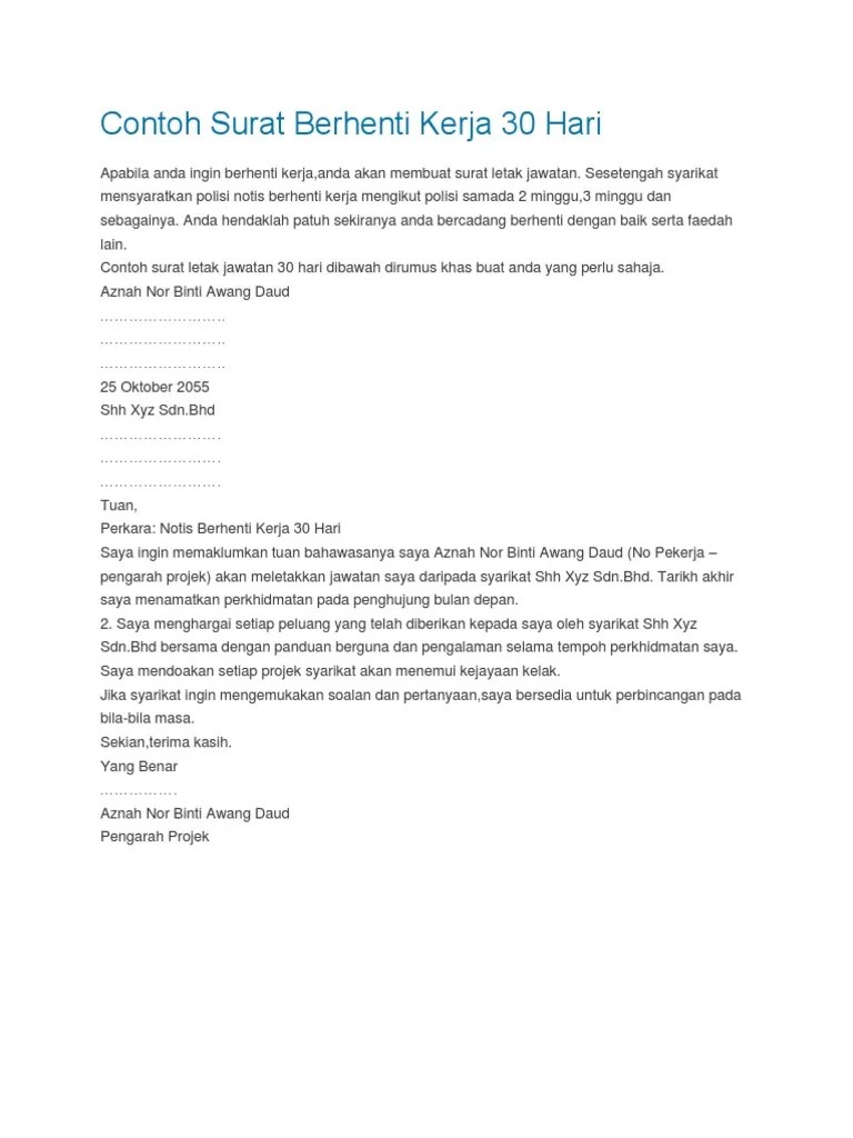 Anda ingin membuat surat perletakan jawatan atau berhenti kerja? Perkongsian contoh surat rasmi notis berhenti kerja resignation letter adalah dalam bahasa malaysia dan . Contoh mudah surat rasmi berhenti kerja terbaik nur amalina bt kama no 2 jalan anggerik, 123456 kuala lumpur . But, you can copy paste and use the google translate.